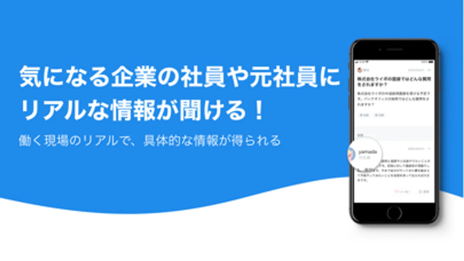 「転職したい企業の社風は?」「うちの会社ってブラック?」など企業に関する質問から、「未経験でエンジニアになるには?」「営業職として活躍するには何をすべき?」などのキャリアに関する質問を匿名で質問することができます!「働く」に関する疑問や悩みを気軽に質問できるアプリです。