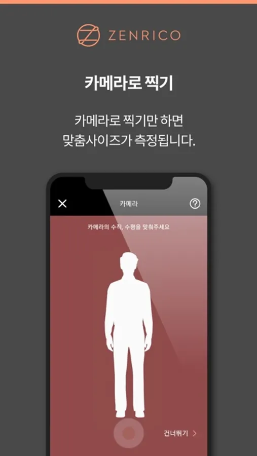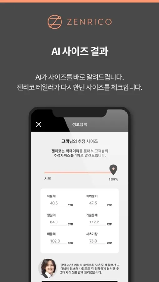 2차적으로 사진을 통해 젠리코 테일러가 고객님의 체형과 사이즈를 더 정확하게 판단합니다.
