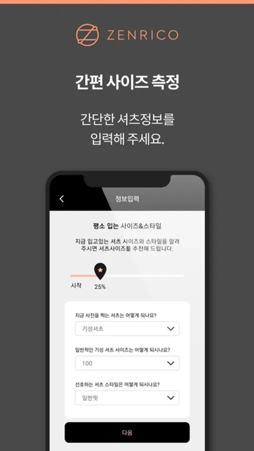 1차적으로 간단한 사이즈정보를 입력하시면 AI 시스템을 통한 사이즈를 받아보실 수 있습니다.