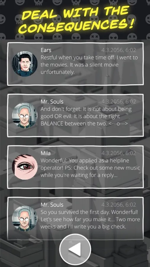 The story of 1-800 SUPER takes place in a dystopian future in the year 2056, similar to ours but humorously exaggerated. The tone of the plot shifts between dark comedy and drama and is generally inspired by classic superhero narratives: Melancholic vigilantes and explosive supervillains fight for their very own goals with and against each other, while the player learns to be the puppet master that makes major decisions in the background.