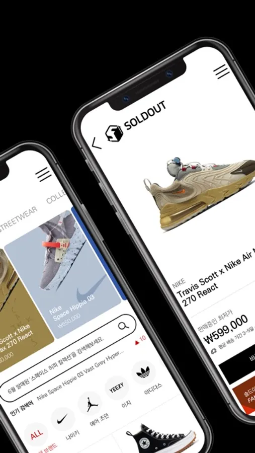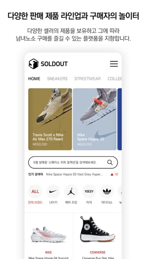 솔드아웃은 국내 최초의 한정판 거래 플랫폼인 아웃오브스탁과 연계하여 다양한 셀러의 제품을 보유하고 그에 따라 남녀노소 구매를 즐길 수 있는 플랫폼을 지향합니다.
