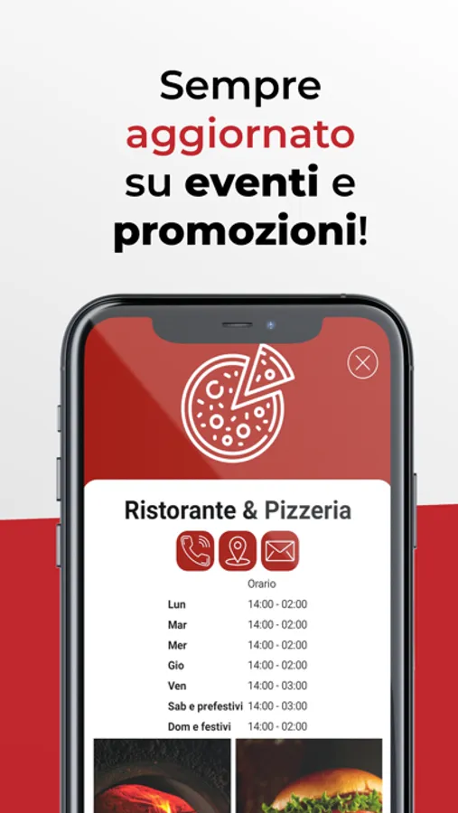 Sarai costantemente aggiornato sui nostri orari e potrai velocizzare l’accesso a tutte le attività, oltre a poter usufruire di promozioni dedicate, consultare il menu digitale ed effettuare l’ordine al tavolo direttamente tramite app.