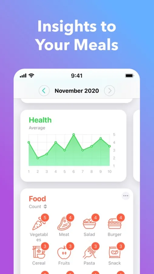 After a few days, you start to see your entries in charts and insights. Find out how often you eat something, how much water your drink, or the typical healthiness of your meal. See how your food influences your symptoms.