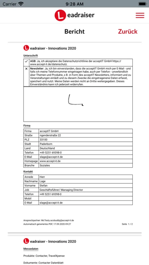 Sie wollen sich per Mail für ein Gespräch bedanken, einen Folgetermin bestätigen oder die gewünschten Informationen senden? Noch bevor die Veranstaltung zu Ende ist, haben Sie mit acceptIT Leadraiser die erste Mail versendet, inklusive Erinnerungsfoto. Denn das Einverständnis zur Datenverarbeitung hat Ihnen ihr Gesprächspartner soeben direkt auf dem mobilen Endgerät unterschrieben.