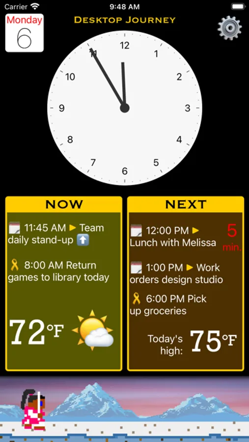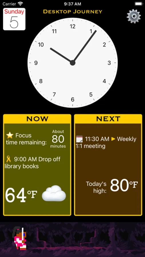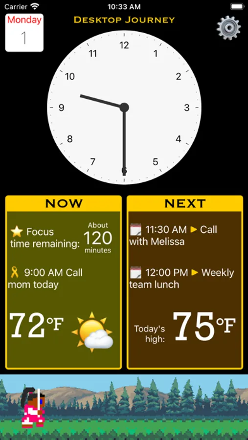 At the bottom of the screen, a hero accompanies you, walking along through various biomes as you journey through your own work day.