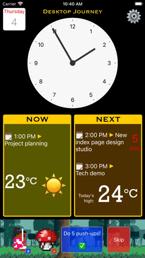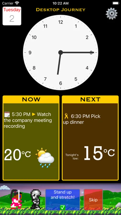 A few times a day, an enemy character will confront the hero. You can defeat the enemy by doing a task, from a set that you customize, such as doing a few push-ups, standing up and stretching, or tidying your workspace. Or, just skip the encounter if it's not a convenient time.