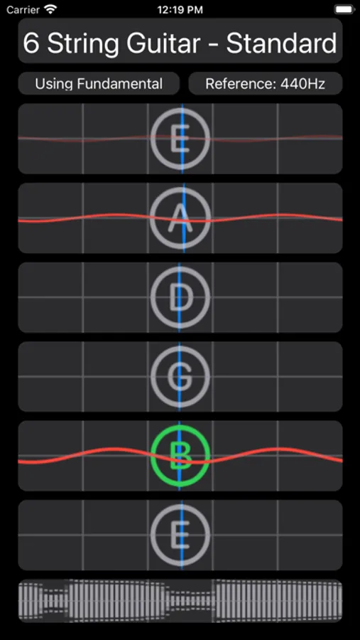 Pluck strings on your instrument and the appropriate needles will respond showing coarse tuning. As you get closer to pitch, a wave overlay will automatically be displayed that shifts left or right depending on your pitch.