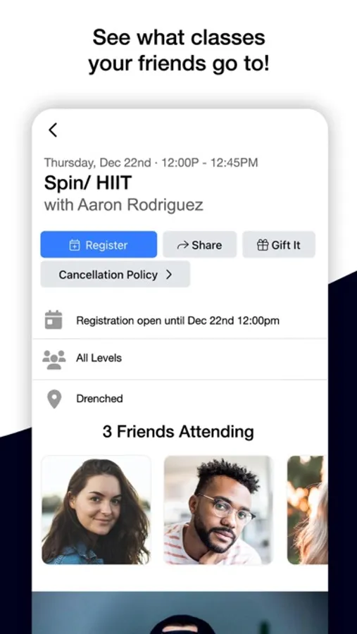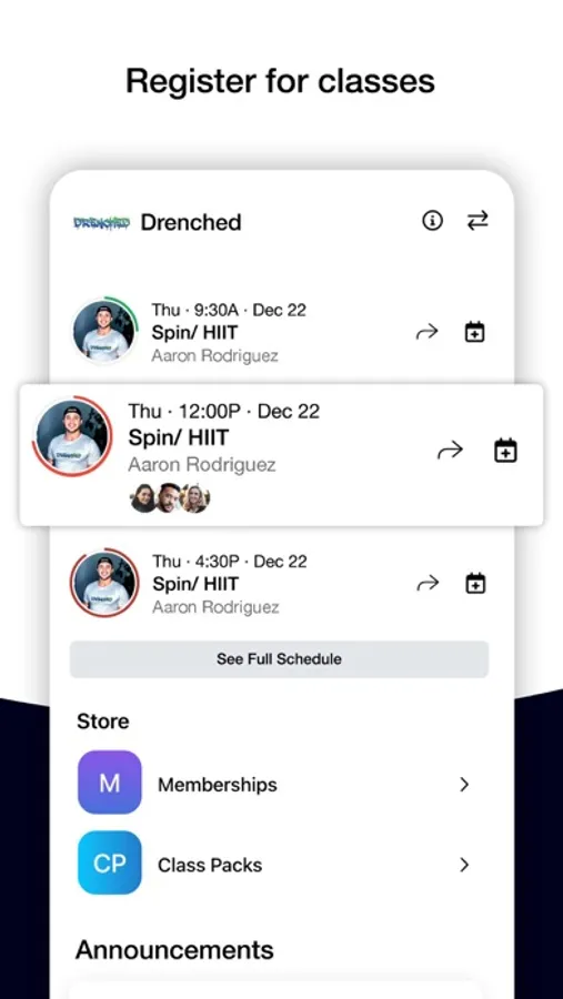 The Drenched Spin and Fitness app is necessary for anyone looking to book a class at the Drenched studio. The app allows you to view class schedule, book a class, invite friends to class, and see which of your friends are attending a certain class. The app allows you to purchase different class packages and leave autopay schedule for future billing. You can receive push notifications which will remind you about upcoming classes and track check-ins.