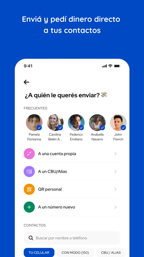 - Enviar y pedir dinero a través de tu agenda de contactos. Olvidate de usar CBU o Alias.