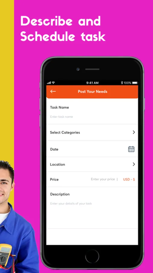 • Easy job posting option that allows the users to place their service needs and specifications clearly and easily such as type of service required, scheduled date and time, location, the duration for that service, etc.