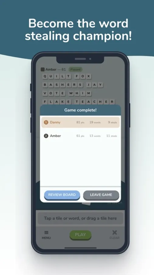 Love word puzzles? Compete with your friends in Words n' Thieves to collect as many words as possible. Make words by combining letters, or steal words from your opponents by turning them into longer words. Earn victory with quick thinking, cleverness, and recognition skills. Prove yourself as the true anagram champion in this competitive and chaotic word scramble!