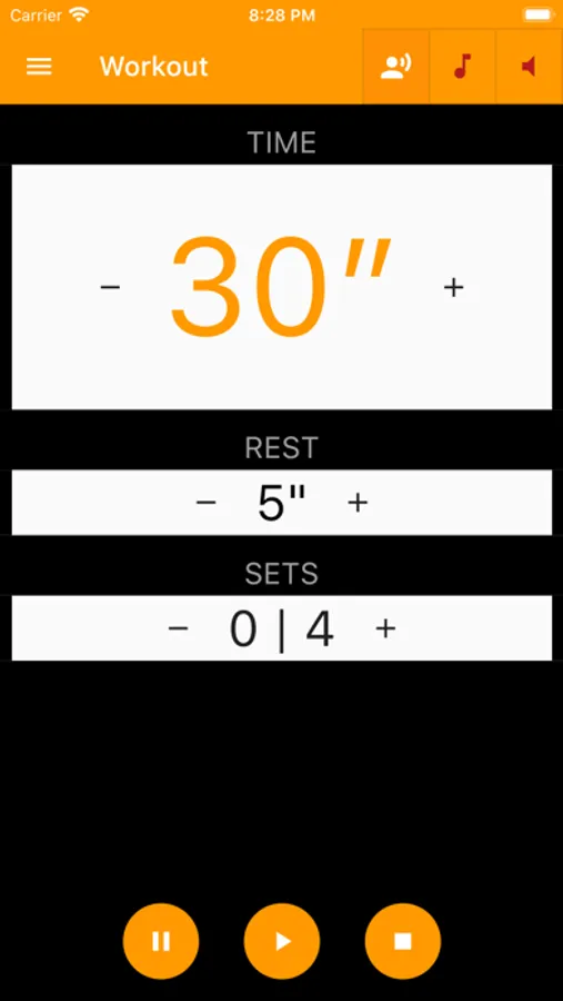 You have the option to set the number of repetitions (up to 99) and their frequency/speed (from 0.2 second to 20 seconds), or the time in seconds you wish to exercise - you can select the mode using the button on the top left; then just set the number of sets (up to 99) and the rest time between sets (from 1 to 99 seconds) by touching the plus or minus buttons. On the top menu, choose how the numbers will be announced: spoken (default), a beep or neither (in case you prefer or need to exercise in silence). Then, on the bottom menu, touch play and get ready to begin!