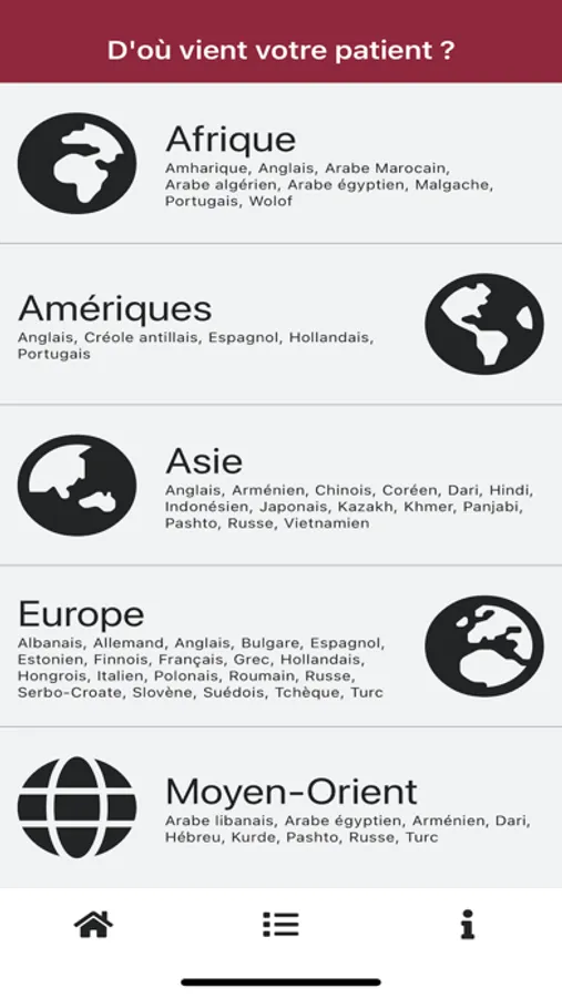 Pour chaque langue, vous trouverez le vocabulaire et les questions indispensables pour l'examen clinique, appareil par appareil.