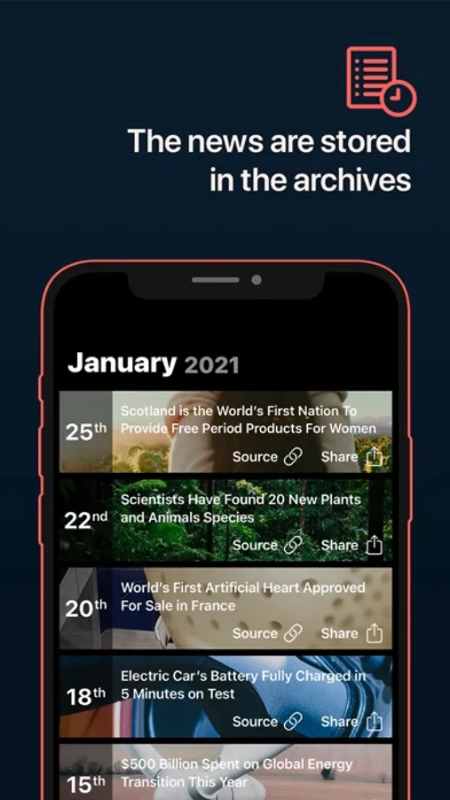 You won't miss a single news since they're all stored in the app archives. Simply scroll through the days and months. You will still be able to open the original source or to share it.