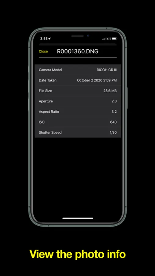 - View photo meta data: iso, aperture, file size, etc.
