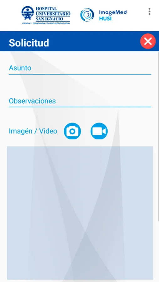 1. Registrar Solicitudes: Formulario de registro de las solicitudes de envío de imágenes y fotos para una opinión u observación de otro médico. El registro de las solicitudes se realiza una única vez, es decir la App no será un Chat entre médicos. Para enviar la imagen o video al otro médico se debe contar con el consentimiento del usuario a través de su firma digital.