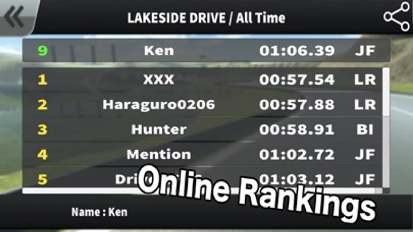 Replay feature to watch your best runs, unique cars, challenging achievement system, ghost, parts search, a variety of statistics, and online rankings where players can compete with each other.