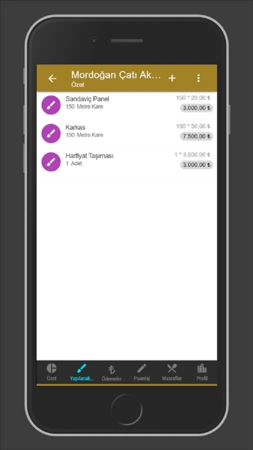 Aldığınız projede yapılacak işleri ve tutarlarını kalem kalem ekleyebilir böylece hangi işin hangi fiyata yapıldığını takip edebilirsiniz. Proje için teklif mektubu oluşturabilir ve iş sahibine pdf-excel olarak sunabilirsiniz.