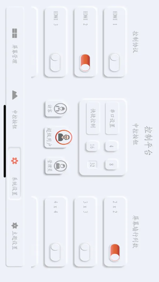 网络控制管理平台APP通过WiFi在同一局域网内可简单方便操控矩阵,比如实现屏幕组合、切换、单屏等操作,简单易用