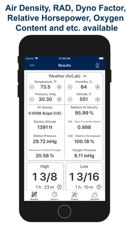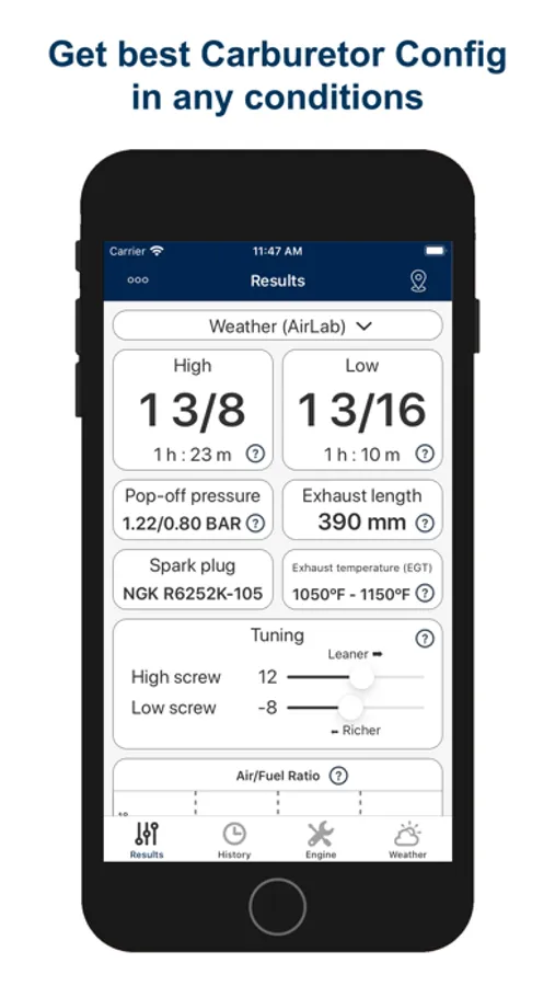 • Results: In this tab high speed screw position, low speed screw position, pop-off pressure, optimal exhaust length, spark plug, optimal exhaust temperature (EGT) are shown. These data are calculated depending on the weather conditions and the engine configuration given in the next tabs. This tab lets do a fine tuning adjustment for all this values to adapt to the concrete engine. Also the air density, density altitude, relative air density, SAE - dyno correction factor, station pressure, SAE- relative horsepower, volumetric content of oxygen, oxygen pressure are shown too. On this tab, you can also share your settings with your colleagues. You can also see in a graphic form the calculated ratio of air and fuel (lambda).