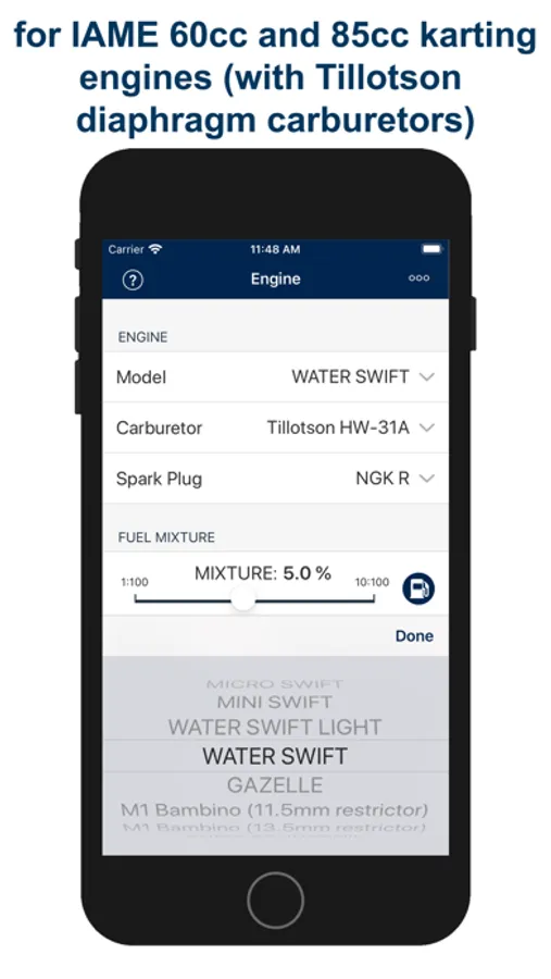 This app provides, using temperature, altitude, humidity, atmospheric pressure and your engine configuration, a recommendation about optimal carburetor config (jetting) for karts with IAME Micro SWIFT, Mini SWIFT, Water Swift, Gazelle, M1 Bambino, Puma engines which use a Tillotson diaphragm carburetors