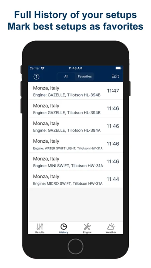 • History: This tab contains the history of all carburetor configs. This tab also contains your favorite carburetor configs.