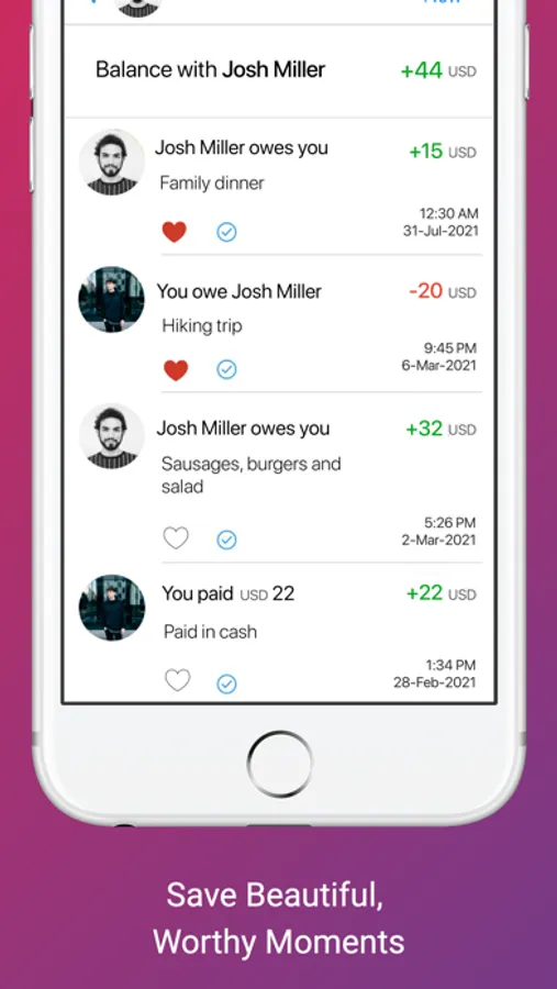 For example, your friend paid for dinner and you owe him for half the bill. Enter this amount in Zap and you can both easily view and confirm the amount. And as you enter new activity, Zap will start balancing all on its own, allowing you to see your net balances at a glance.