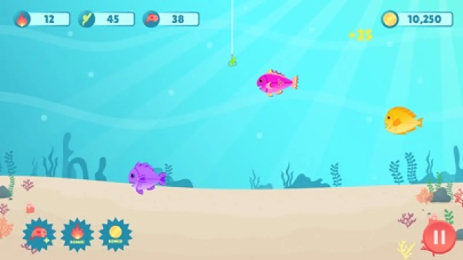 - Purchase fishing bait, fishing rods, and boosts to advance through the game