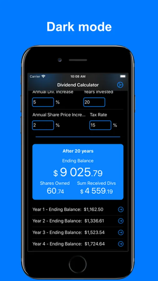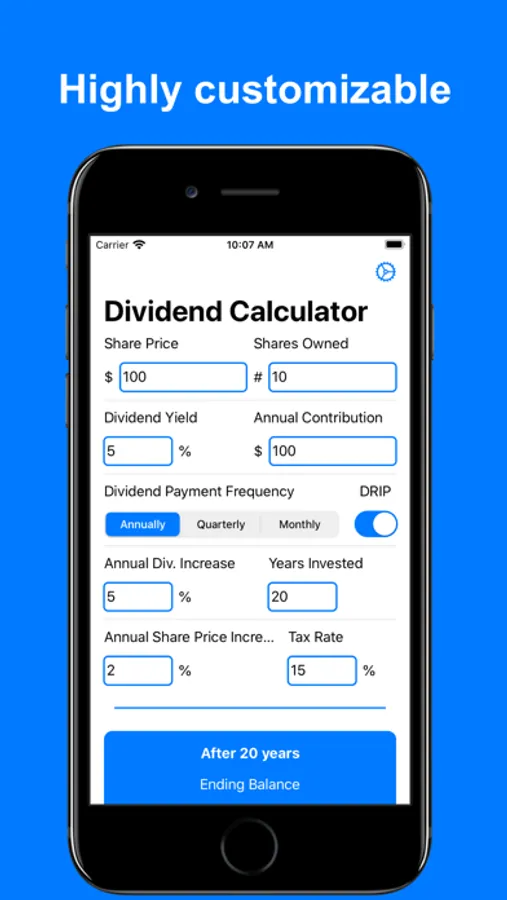 DivCalculator allows you to calculate the estimated future value of your investment by only inputting a few assumptions. Our compound interest formula will take into account many parameters like the dividend yield, estimated stock price appreciation, tax rate and dividend distribution frequency besides many others.
