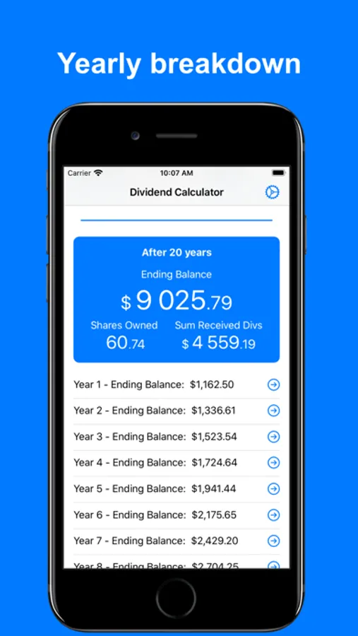 DivCalculator calculates the ending balance, shares owned, annual dividend income and total dividends received for each year.