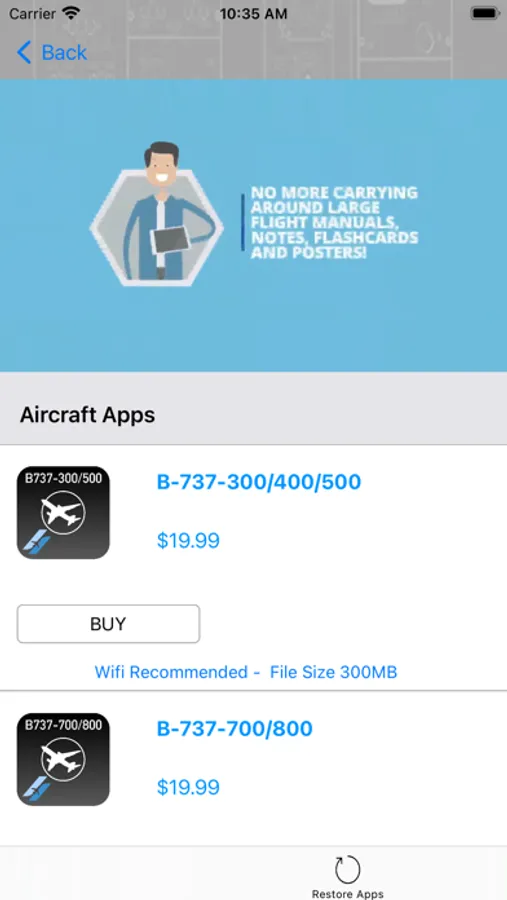 STEP 3: Tap the Buy button under the aircraft you wish to purchase. Your account will be charged a one time price for the material and content. The price is listed on each Aircraft App and the price will be different based on the content in each app.
