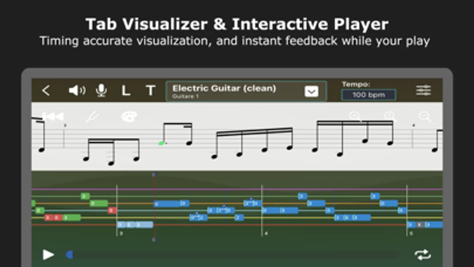 An interactive guitar, bass and drum tab player. Let users load their own Guitar Pro tab files, and visualize them in an intuitive form. Listen to user's play and provide real-time feedback on timing and accuracy. Make it a game-like experience to play and learn new tabs.