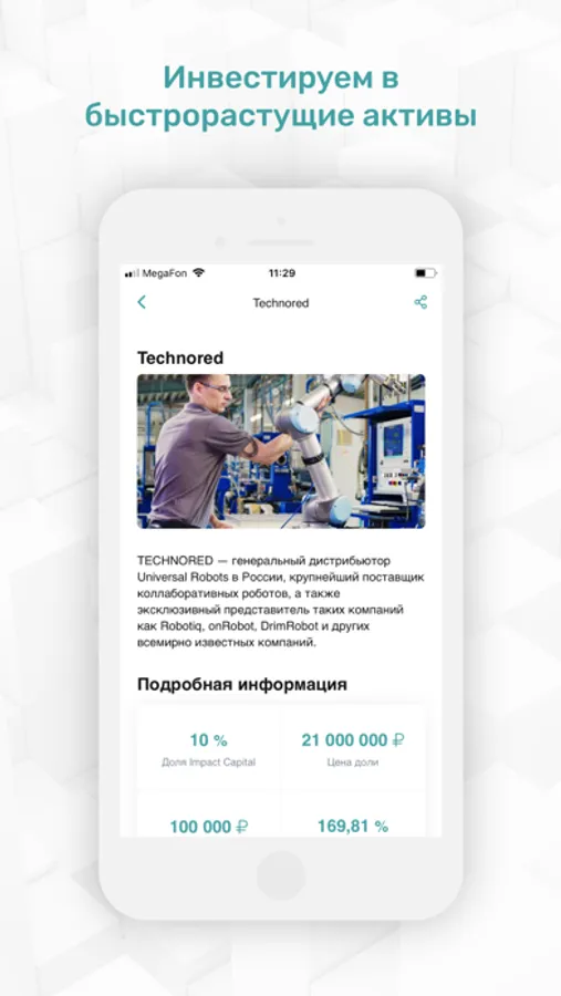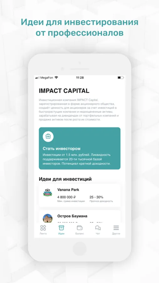 Приложение предназначено для тех, кто интересуется профессиональным инвестированием. Инвестиционная компания IMPACT Capital, зарегистрированная в форме акционерного общества, создаёт ценность для акционеров за счет инвестиций в быстрорастущие компании и недооцененные активы, зарабатывая на дивидендах от портфельных компаний и продаже активов после роста их стоимости.