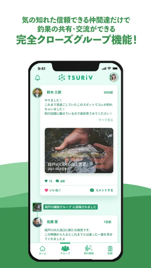 TSURiVの共有機能は全てクローズドなグループで行われます。そのグループも招待で作成するため、本当に共有したい人だけのグループでお気に入りの釣行記録を共有することができます。