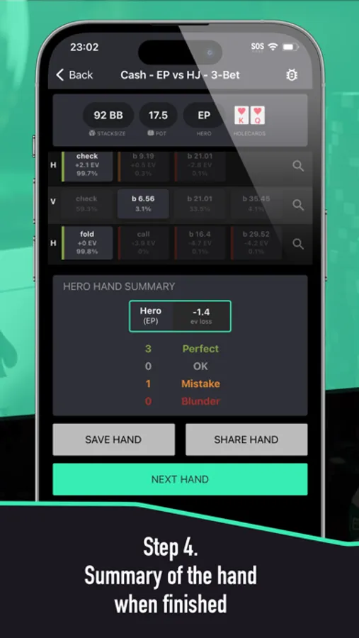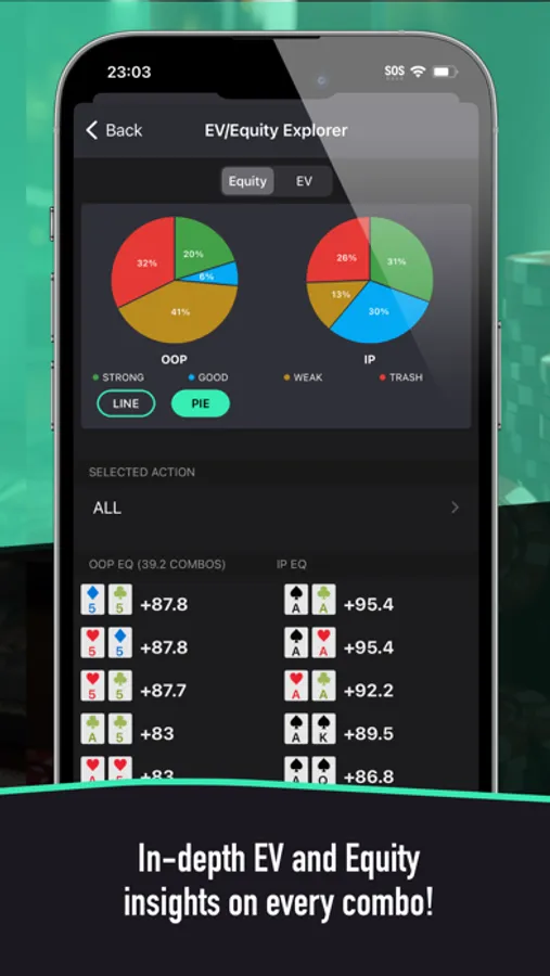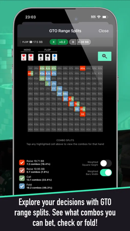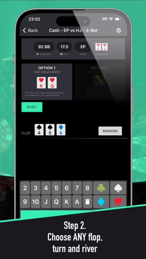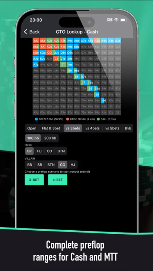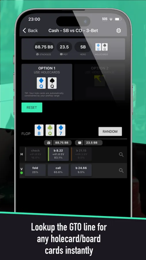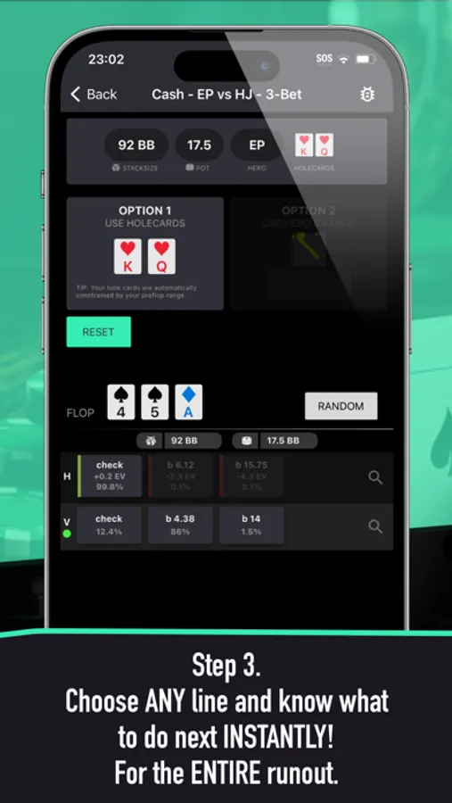 Your personal GTO postflop lookup assistant and poker engine AI solver in your pocket. No need for complex tree building and then buying grunty super computers to run postflop solves. We did all the hardwork and making it accessible to you via a few clicks on your mobile phone. Just pick a spot, enter your hole cards, the board and viola! You can see the GTO line for all possible turn and river with the exact frequencies and EVs.