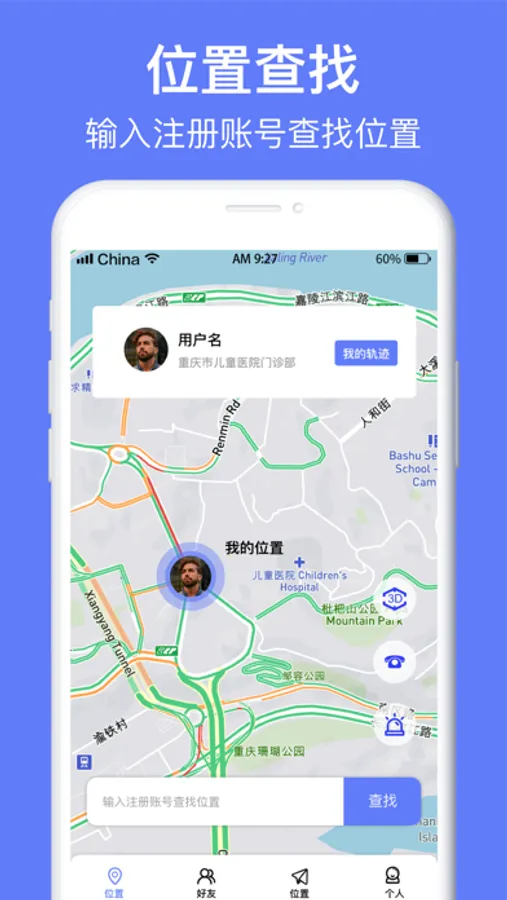 *仅输入注册的号码即可查找好友,时刻关心他的位置。