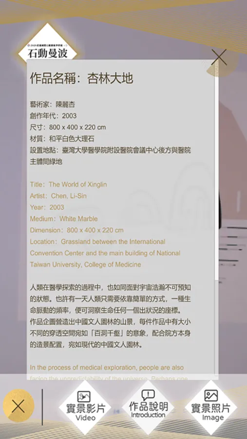本展覽規劃設計全國精選石雕藝術地圖AR互動裝置,透過下載本APP於展覽現場掃描標牌,即可透過手機、平板裝置觀看全國精選石雕藝術作品影像及簡介。
