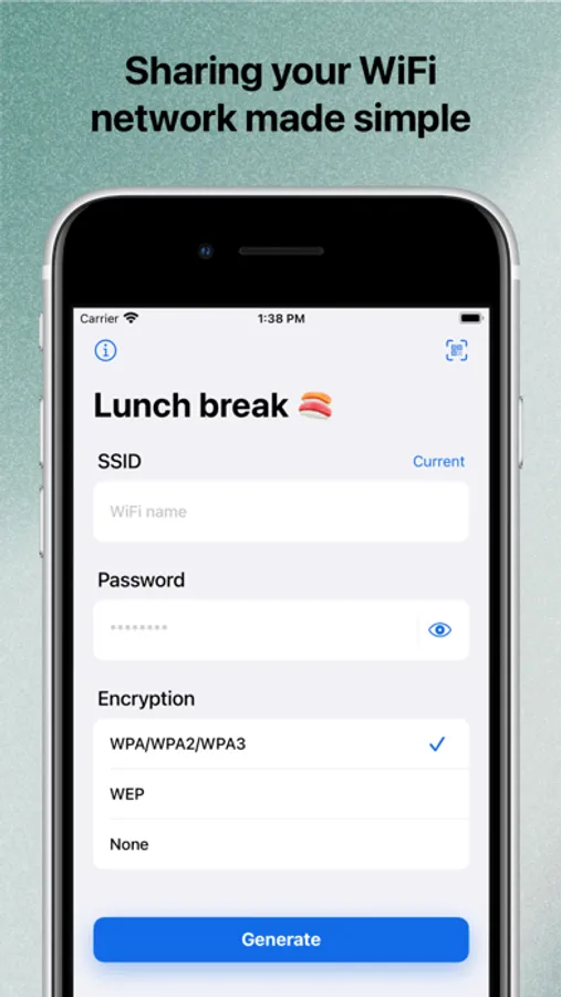 Forget having friends or customers constantly asking your WiFi password to connect to your network. Now with QRiFi all you have to do is type the WiFi SSID and password once on your device, generate your own WiFi QR code in seconds, save it in the app and that's it! The next time someone asks you to share your WiFi password, just show your custom WiFi QR code made with QRiFi! Isn't it so easy and time-saving?