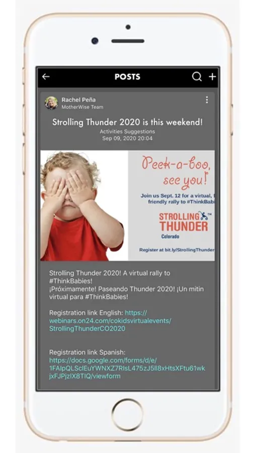 Puede publicar artículos, compartir consejos sobre embarazo y nuevos bebés, ver videos y chatear directamente con otras madres. ¡También se mantendrá al tanto sobre todos los nuevos programas y eventos especiales que MotherWise tiene para ofrecer!