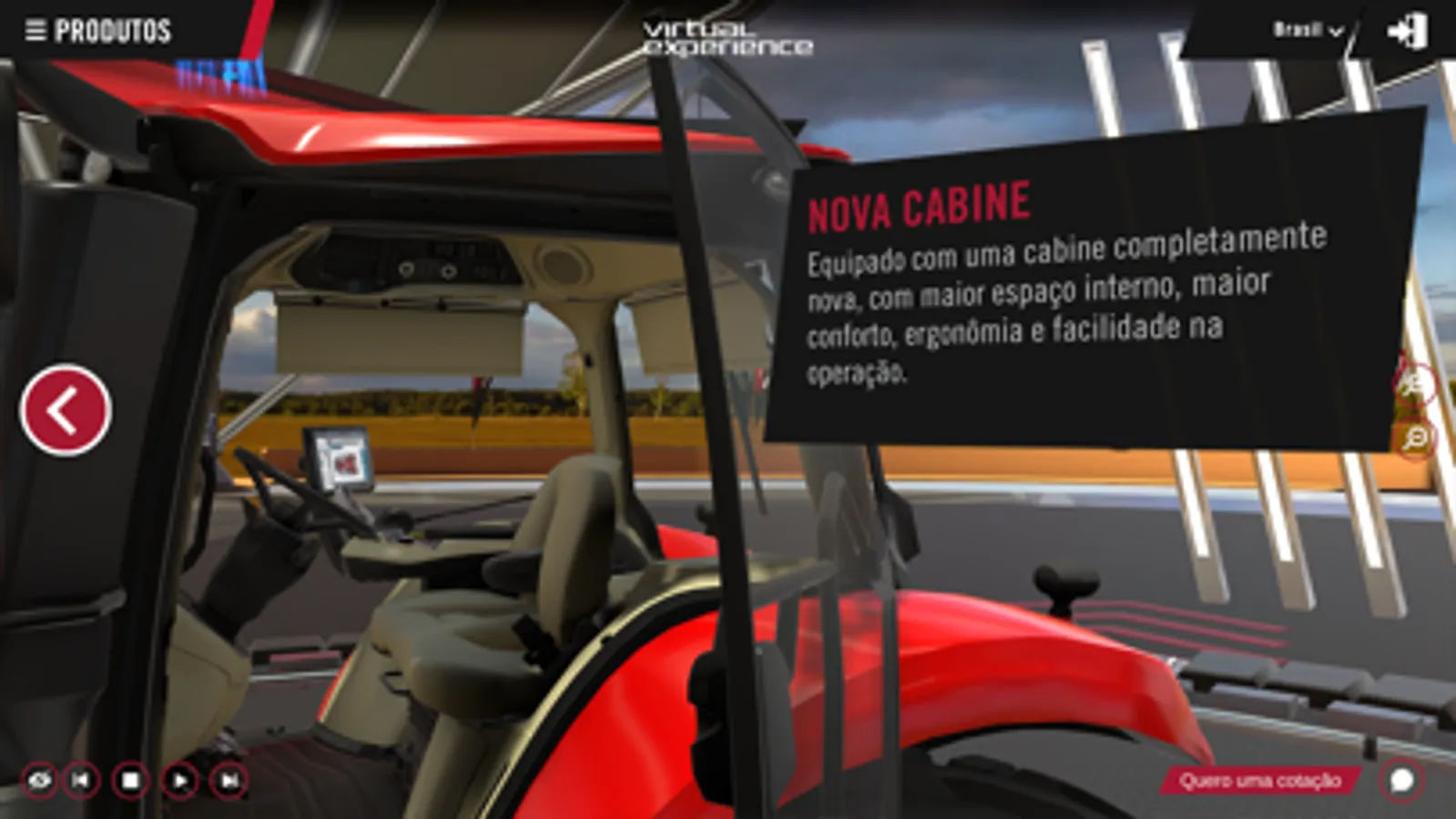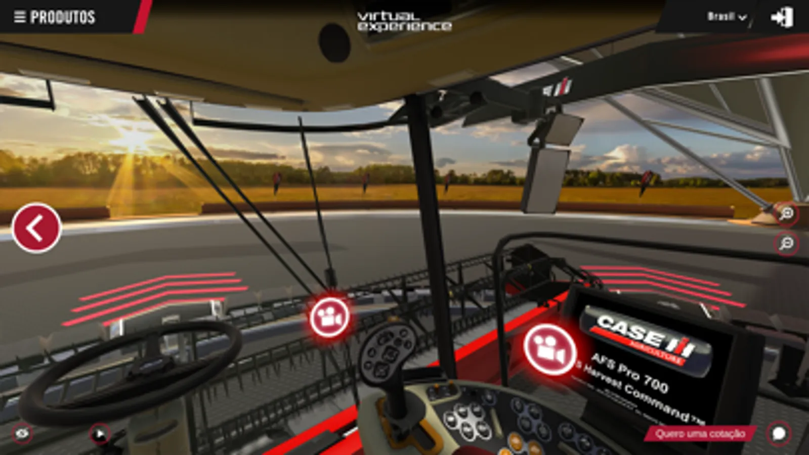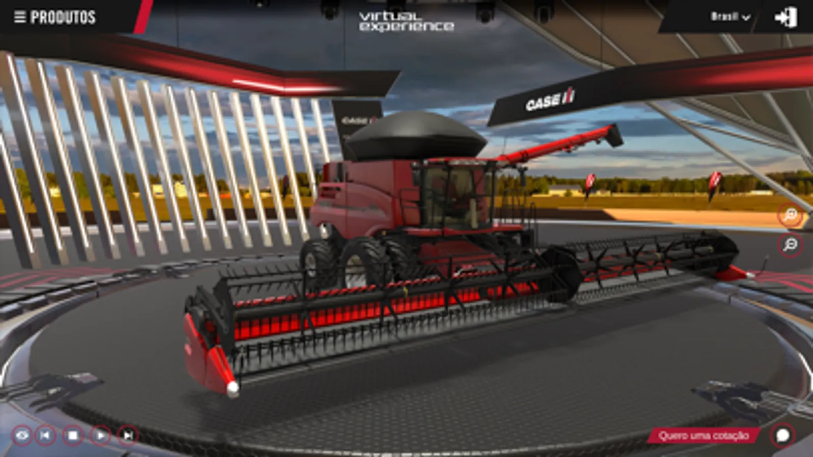 O CaseIH Virtual Experience é uma plataforma que usa tecnologia de ponta para levar o usuário de onde ele estiver para dentro de um showroom virtual CaseIH de forma imersiva e interativa. Experimente uma forma nunca vista antes de conhecer e explorar as novas colheitadeiras da família Axial Flow em nosso Showroom Virtual.
