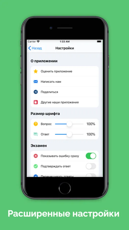 Все вопросы разделены на небольшие списки. Изучай вопросы и тренируйся. Сдавай экзамен на 10 вопросов. Легко находи нужные вопросы через поиск. Добавляй сложные вопросы в избранное. Отслеживай свой прогресс обучения.