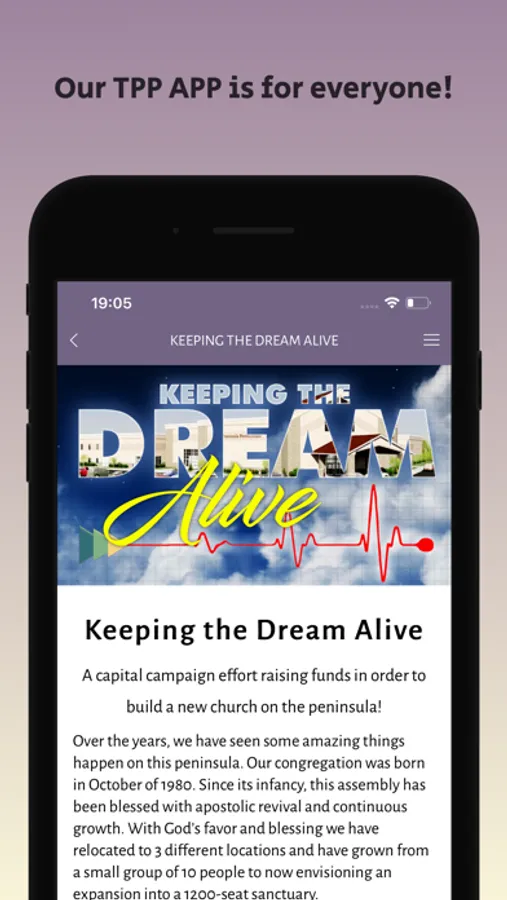 Our TPP APP is for everyone! Our desire is to keep you informed of all the activities at TPP and our ministries. Through this APP you will be able to receive push notification of important upcoming events and communication, access video and audio podcasts, read about activities, events, and special endeavors, as well as connect to social media and 'contact us' information.