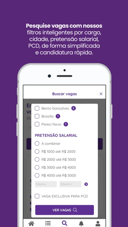 Pesquise vagas com nossos filtros inteligentes por cargo, Cidade, pretensão salarial, PCD, de forma simplificada e candidatura rápida.