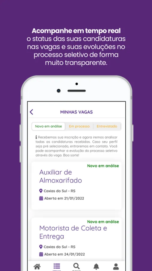 Acompanhe em tempo real o status das suas candidaturas nas vagas e suas evoluções no processo seletivo de forma muito transparente.