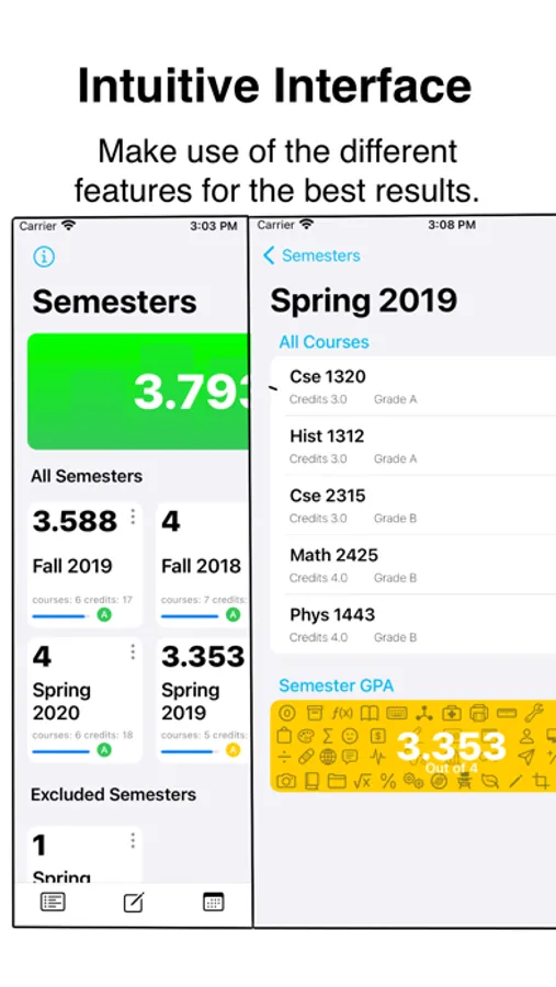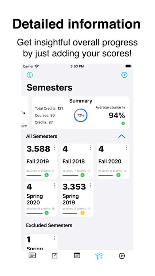 Calculator- A 4 point GPA calculator that stores all the information about your classes and semester. No need to calculate your expected or actual GPA after every semester. It is quick to set up, and you can watch your progress throughout your university life. Include or exclude a semester from your overall GPA to see how it would affect your GPA IF you had performed in a certain way. Use this feature to exclude the current semester's GPA so that it does not reflect in the overall GPA. Each semester has different courses in it. Each course has different syllabus items, and a customizable grading scale to receive the most accurate grade for a class. GPA calculator also has graphs that allows you to analyze your semesters.