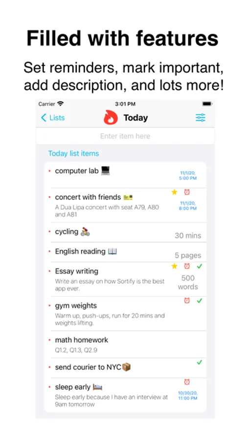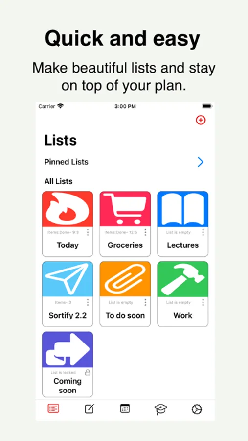 List- Create beautiful lists of things and separate them into different categories. Add quantity, unit, or date. Add a description for that item if there is something more associated with it. Mark the item as done when you have completed it or important if you don't want to miss it. Sort or search the list when the list is long, for quick access. Share the formatted list across platforms so others around you can also see the items on your list. Pin the most important category for quick access. Edit and delete the items or categories easily by swiping the cells in the table. Set a reminder for an item from the list. Never again worry about what to do or not to do.