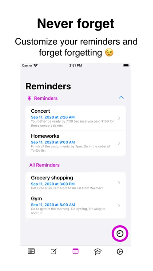 Reminder- A simple reminder app that is easy to set up and fully customizable. Set the reminder with or without the time, and customize the title and subtitles as you wish. Simplicity is the key, which makes it quick to set up. Turn on the auto-delete switch to automatically delete the reminder when you open the app.