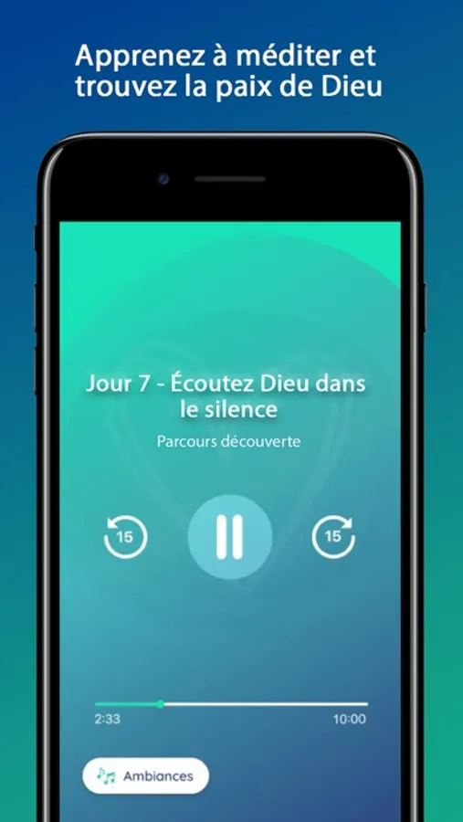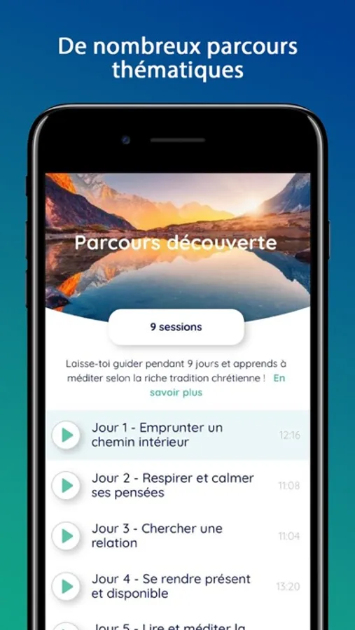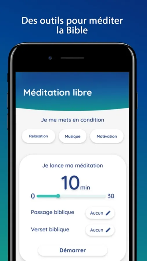 Ensuite, tu trouveras de nombreuses méditations guidées autour de thèmes (joie, paix, plénitude, gestion du stress et des angoisses,...) et de passages de la Bible. Tu trouveras également un écran de méditation libre avec divers outils te permettant de te relaxer (notamment avec des exercices de relaxation issus de la méthode Vittoz, des exercices de respiration,...) puis de prendre un temps de silence avec Dieu, accompagné d'un passage ou d'un verset biblique si tu le désires.