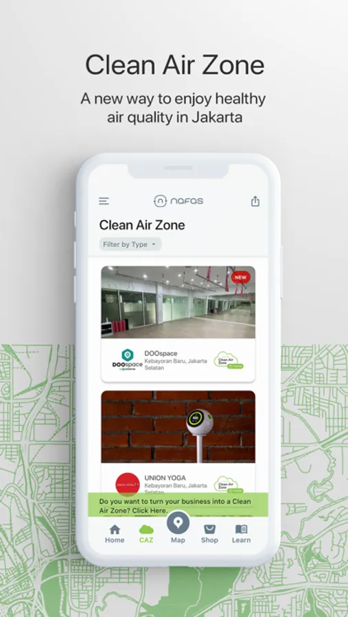 A new way to stay healthy. For the first time, you can access a curated directory of public locations in Jakarta that have been certified to have healthy indoor air by nafas. Consisted of public gym, yoga studio, beauty stores across Jakarta, we have more than 10 locations across Jakarta and new locations are coming every month.