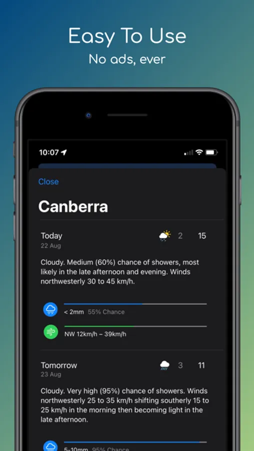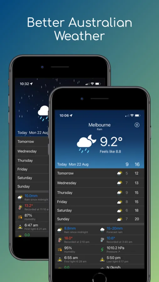 Better Weather Australia provides a clean and easy to use experience, to get all the info you need, and none of the fluff that makes other weather apps so hard to use.